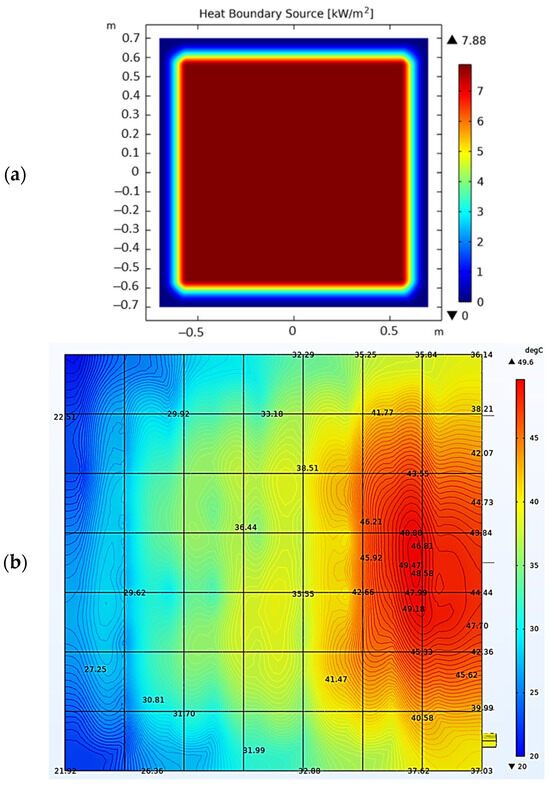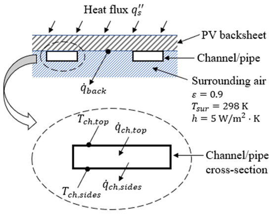 The 4 different embedded serpentine-shaped water flow configurations were numerically modeled in the ANSYS FLUENT module. The front side of the PV panel was subjected to a constant heat flux of while the sides and the back of the panel were exposed to surrounding air at , as shown in Figure 5. An emissivity of was considered for all surfaces exposed to surrounding air.