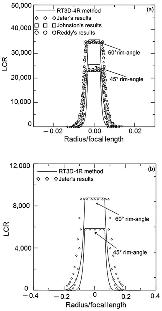 (a): Distribution (LCR) at 45° rim angle and 60° rim angle for a sun subtend angle of 16 arcminutes, and (b): Distribution (LCR) at 45° rim angle and 60° rim angle for a sun subtend angle of 32 arcminutes.