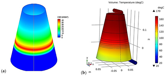 In this section, the concentrated solar density (CSD) distribution on the conical cavity receiver is discussed. With the same case studies investigated in previous work [54], the simulation details are used with characteristics: wc = 2.5 m, f = 3 m, rmax = 0.1 m, rmin = 0.05 m, θS = 16′ and ES = 1 kW/m2. The simulation outcomes are illustrated in Figure 7. It is evident that the CSD distribution exhibits a non-uniformity aspect along the cavity’s height. Furthermore, the highest CSD value is around 40 kW/m2 situated at 0.1 m from the conical cavity bottom base. Compared with that found by Daabo et al. [46,47], this finding proves the reliability of the presented simulation method.