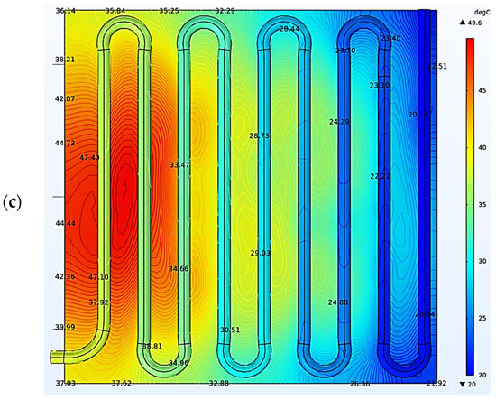 Figure 8b,c depict the temperature distribution of the cooled solar cells using conventional water-cooled pipe. For a full pipe flow, the maximum solar cell temperature has been decreased from 90.5 °C to 49.6 °C.