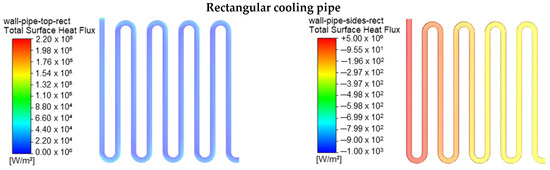The distribution of heat flux on the Interface surface along the coolant conduit and panel rear sheet is depicted in Figure 9 for the four different cooling pipe cross-section cases. Since the contact sides of the cooling pipe channel have different widths, the heat transfer is directly proportional to the contact areas. However, a small difference is observed since the difference between the contact areas of the four different cross-sections is small and is listed in Table 4 as the width parameter for comparison.