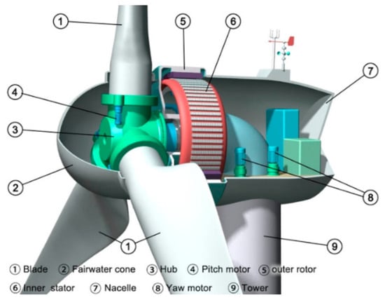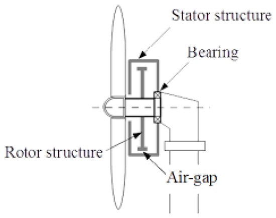 The main components of the generator structure are presented in Figure 2. The blades of the wind turbine generate mechanical rotation by capturing the kinetic energy of the wind. This motion energy is then transferred by the shaft to the rotor. This results in a spinning motion of the rotor inside the stator structure. The rotor and stator are separated from each other by a fixed distance called an air gap. Moreover, the stator is fitted with strong magnets, whereas the rotor accommodates coils of wire. Ultimately, a changing magnetic field is introduced to the system by the spinning magnets, thus inducing an electrical current through electromagnetic induction. Further instrumentation within the nacelle converts the current into a more stable form of electricity.