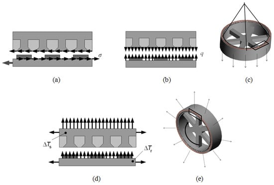 (a) Shear loading, (b) magnetic attraction of the moving and stationary components, (c) gravitational loading, (d) thermal expansion of the generator structure, (e) centrifugal loading [7].