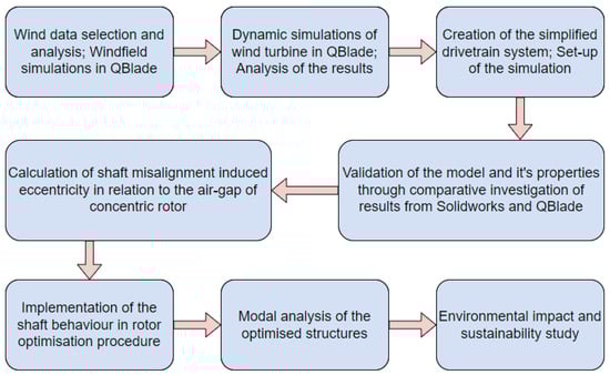 The methodology of the conducted research can be found in Figure 6. Firstly, real-world wind datasets were obtained and selected after careful investigation and appraisal of the corresponding wind farms. The chosen data package was then further analysed and edited. This resulted in the creation of three aerodynamic settings corresponding to the considered wind speeds: Low, Rated and High. Moreover, the wind patterns at the chosen site were specified. The obtained data was validated through a correlation study of wind speeds and corresponding altitudes. To translate the real-world wind behaviour to software-aided analysis, windfield simulations in QBlade (CE v 2.0.4.8) were conducted. The obtained results were compared against real-world data. Subsequently, the validated windfield data were used in dynamic, structural simulations on a 5 MW wind turbine in QBlade. Thus, output values for normal stresses on the blades were acquired. Following the analysis of the wind turbine in QBlade, a simplified drivetrain system was created. Finite element analysis of the system was conducted after the simulation set-up procedure in Solidworks, which consisted of material properties specification, application of fixtures, and mesh independence study. The results were then validated through comparative investigation between the gathered data from QBlade and Solidworks. Furthermore, the shaft misalignment induced eccentricity in relation to the air gap of the concentric rotor was calculated for the Rated and High aerodynamic settings. The resultant shaft deflections were included in the rotor optimisation procedure, which consisted of rotor structural configuration selection, static FE analysis, topology optimisation, parametric table optimisation, and modal analysis of the optimised structures. Lastly, the environmental impact and sustainability of the proposed designs and procedures were studied.
