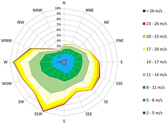 Having a significant amount of data measured over a 2-year period, wind direction probability can be identified to analyse the working environment of wind turbine while operating. Firstly, the wind data for wind directions and wind speeds was limited to only one column set corresponding to closest hub-height altitude of 5 MW wind turbine—altitude 2. The chosen data were then sorted according to wind direction in 22.5° increments, ultimately resulting in a specified data set with identified 16 cardinal directions. The wind speeds were then divided into nine categories corresponding to the chosen values, sorted, and counted in Excel in order to produce a clear probability table that refers to the wind speed and wind direction values over the measurement period—2 years. The data can be presented as a wind rose (Figure 7) for better presentation of the results.