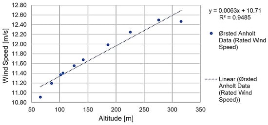The average wind speeds were then calculated for each of the 3 settings for 10 predetermined altitudes. The obtained results followed a normalised pattern with coefficient of determination R2 of over 0.94, which shows a good correlation of the data and minimum impact of the irregularities. The exemplary correlation graph for Rated wind speed can be seen in Figure 8.