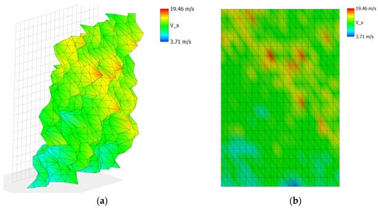With the average wind speeds found at specified altitudes, further validation study can be conducted. By using the QBlade simulation software, it is possible to create a windfield—a three-dimensional spatial pattern of winds—which will be used in the following structural simulations as an aerodynamic load on blades. However, firstly, the already verified Anholt wind farm data needed to be compared to the software’s output data in order to correlate and validate the two sources of data against each other. For this purpose, the wind speeds for Low, Rated, and High settings were recreated in the software and compared to the real-world data. The simulated windfields can be shown as three-dimensional graphs, and an example of an output graph can be seen in Figure 9a,b. The windfield changes over time of the simulation, acting like a turbulent model and mimicking the natural flow.