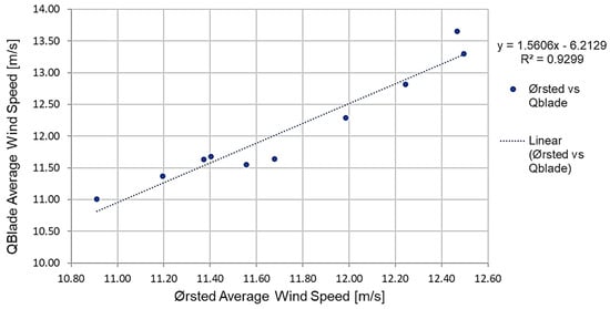 To correctly validate the QBlade data against Anholt data, another correlation study was performed. Instead of comparing the wind speed average values against the altitude, the windspeed values from two sources were compared against each other. With the high correlation of the data sources (R2 > 0.929), it can be demonstrated that the translation of real-world data at Anholt wind farm to QBlade’s software was validated. The exemplary correlation graph for average wind speed can be seen in Figure 10.