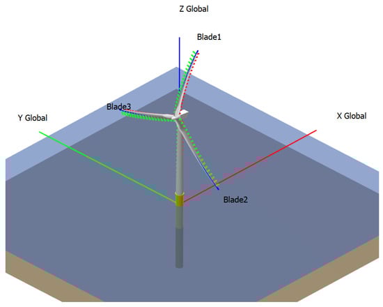 For the purpose of conducting the study, a computationally designed 5 MW monopile wind turbine structure was needed. QBlade offers advanced capabilities of modelling and designing such equipment without necessary CAD models. The structure investigated in this study was taken from an official online repository website owned by QBlade [15], which shares the same technical parameters as described in the technical reports from NREL. In order to find the loads on the blades exerted by the wind conditions, the verified windfields were introduced to the system along with the 5 MW NREL monopile wind turbine model. The schematic model of the system is shown in Figure 11.