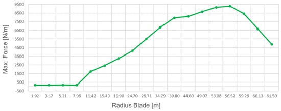 The dynamic simulation of the wind turbine model was comprised of 1000 timesteps, during which the data were gathered. Moreover, at the beginning of the simulation study, the wind turbine was given an independent ramp-up time of 20 s (ramp-up of rotational speed up to a predetermined rated rpm of 12.126). The main outputs for these simulations are normal forces on blades for three different settings. The results are presented as numerical values per section of the blade. This means that the blade was divided into 18 sections, and corresponding forces are specified in . The exemplary results for the Rated setting and its maximum normal forces are presented in Figure 12.