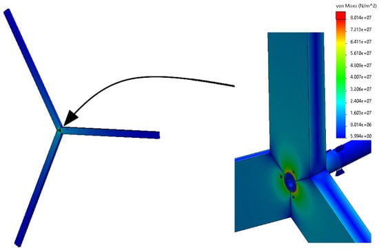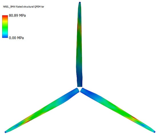 By comparing the maximum stress values on rotor structure obtained in QFEM analysis in QBlade and FEA analysis in Solidworks for the Rated setting, the overall simulation process can be validated. QBlade output value was 80.89 MPa, whereas Solidworks output value was 80.1 MPa. This results in a value difference of 0.98%. Therefore, the proposed investigation technique was assessed to be justified.