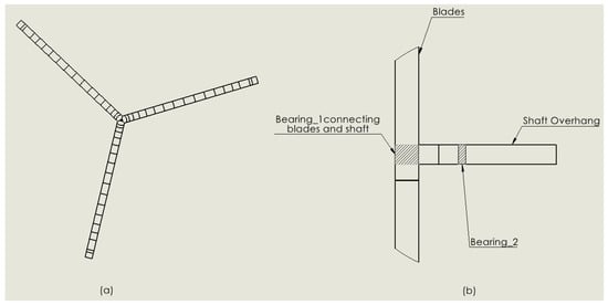 Bearings were not modelled in Solidworks. Instead, the bearing fixture feature was used, which resulted in ideal connections between the blades and the shaft. Moreover, it fixed the shaft about the X and Y axes and allowed for rotational movement. The shaft structure was given an overhang section of 4600 mm after Bearing_2. This resulted in a transposed end face of the shaft, which was fixed along the Z axis, and limited the impact of the fixture on the studied shaft section—the generator area. This was done in accordance with St. Venant’s principle, which states that the strain produced by forces applied at one end of a long cylinder are much larger near the loaded end than at points at a larger distance [16,17]. As a result, the deformation at the corresponding generator area was not affected by introducing the additional constraint. When applying the bearing fixtures, the shaft has been divided into four sections using the split line feature in Solidworks. Lengths of the sections were dependent on the structural properties of Bearing_1 breadth, Bearing_2 breadth, shaft overhang, and shaft length between Bearing_1 and Bearing_2 (generator area), as can be seen in Figure 14. Two types of bearing fixtures were considered: rigid and flexible, where flexible fixtures had a combined radial stiffness of [8]. Rigid fixtures were taken into consideration and later compared tothe flexible fixtures, although it was assumed that flexible bearing fixtures will better portray the behaviour of the system under loading conditions. For the purpose of constraining the model and calculating the radial stiffness for individual bearings, the same approach was made as in [18], corresponding to the parallel spring theory by using Equation (1).