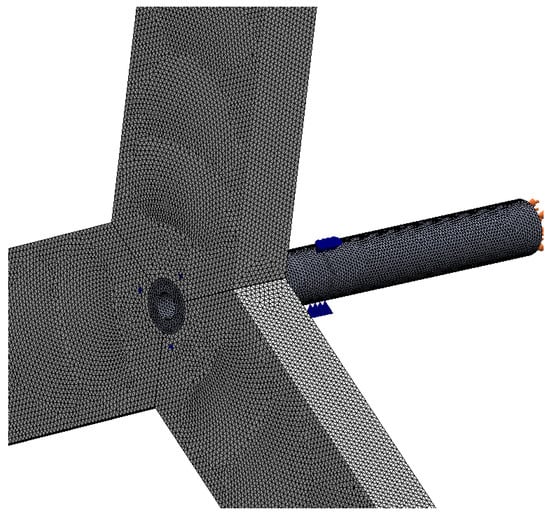 In this section, the results that describe the behaviour of the 5 MW wind turbine powertrain under the worst-case scenario—corresponding to the High setting, also named here as the most demanding aerodynamic conditions and under the typical working operating conditions, the Rated setting—are presented. The first step was to generate an appropriate mesh for the structural model. Due to the significant size of the assembly, blended curvature-based meshing feature was used. Ultimately, two different mesh sizes were used for the model. A coarser mesh was chosen for the blades, whereas by using local mesh control on the shaft, a smaller sized mesh was introduced. Once the general characteristics of the meshing technique were examined, a mesh independence study was conducted. Mesh for the blades had a maximum element size of 100 mm and a minimum element size of 10 mm, whereas the shaft had maximum and minimum element sizes of 62 mm and 55.8 mm, respectively. This resulted in total numbers of 7,816,261 nodes and 5,543,022 tetrahedral elements, see Figure 16.