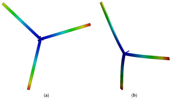 The nominal air gap was 6.36 mm. As seen in Figure 17a,b and Figure 18, the overall deflection and stress of blades follow a standard distribution of a cantilever beam. The highest displacement was present at the tips of the blades and continued to gradually decrease, as the distance from the shaft to the studied blade section was getting smaller. Every blade experienced a different deflection due to varying loading conditions, as indicated by the colour scale. The highest stresses were located at the connection point between the shaft and blades, as expected.