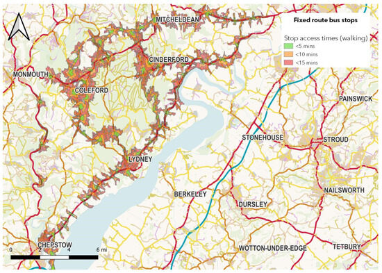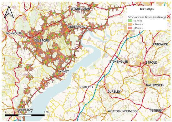 The Robin service reaches across the area, with virtual bus stops within the reach of 44,448 people—over half of the total population of the Forest of Dean (87,107)—within a 10 min walk. There are over 9000 more people within the DRT area who live within a 5 min walk of a DRT stop than within a 5 min walk of a fixed stop—36,000 versus 26,500 for fixed stops (see Figure 3).