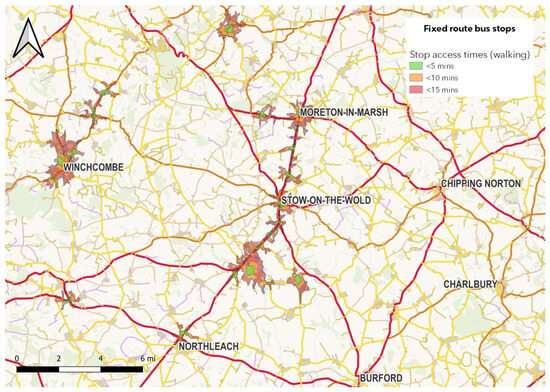 In the North Cotswolds, where the population is smaller—just 32,000 people [47]—and even less dense, fixed routes make very little sense. The DDRT stops cover a similar proportion of the population, again, with over 50% of people living within a 10 min walk of a virtual bus stop (see Figure 4). The design of this system reduces the overlap between fixed-route and DRT provision, so it covers a different population. There are few DRT stops in the denser villages but far broader coverage of the area, augmenting the fixed routes.