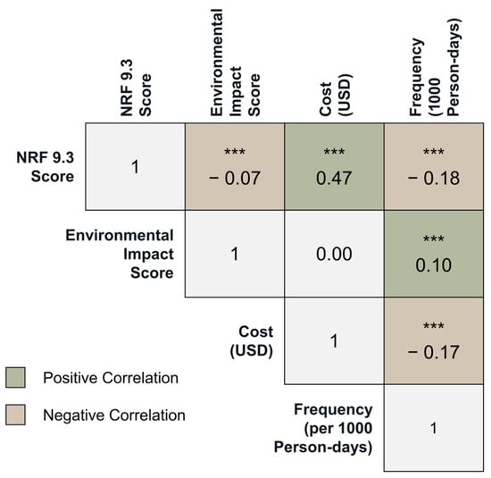 Correlations of nutrition, environmental impact, and cost indicators measured per 100 kilocalories and the frequency of consumption measured per 1000 person-days among FNDDS foods and beverages. The correlation matrix represents the Spearman correlation coefficients between indicators measured per 100 kilocalories and 1000 person-days for all foods and beverages. Significant correlations between indicator scores are indicated as *** p-value < 0.001.