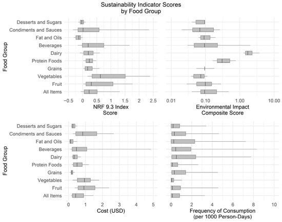 Boxplots represent the median and interquartile range of nutrition, environmental impact, and cost indicators measured per 100 kilocalories and the frequency of consumption measured per 1000 person-days within each food group. Whiskers represent 90th and 10th percentile values.