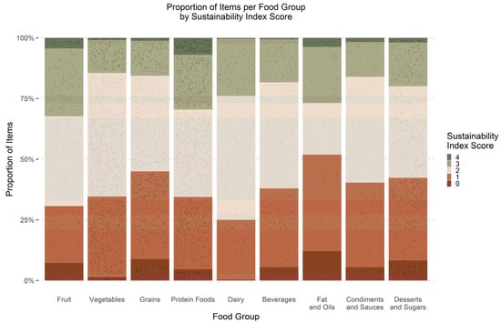 A total of 165 foods and beverages were identified as optimally sustainable (i.e., scored a maximum Sustainability Index score of 4). Protein Foods comprised the majority, contributing to the highest number of optimal items (102 items, representing 62% of all optimally sustainable items). In contrast, Dairy had the lowest number of optimal items, with just one item accounting for less than 1% of all optimally sustainable items. As depicted in Figure 3, Protein Foods also had the highest proportion of optimally sustainable items, while Vegetables had the fewest items in that category. Items with a high sustainability index score of 3 or 4 accounted for a greater proportion of items among Fruit, Protein Foods, and Fats and Oils. Fats and Oils also had the highest proportion of items with a low sustainability index score of 0 or 1, followed by Grains and Desserts and Sugars. Dairy had the smallest proportion of items with a low, as well as high, sustainability index score.
