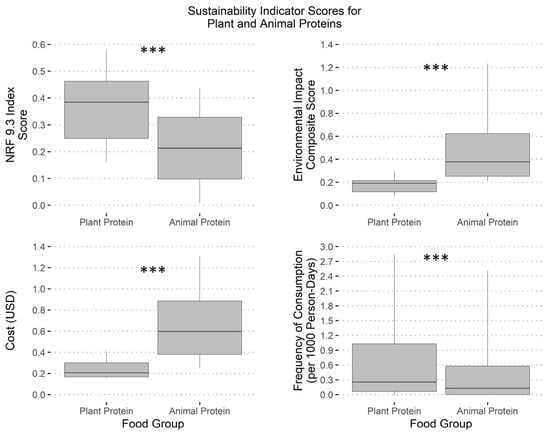 Notably, the Protein Foods food group had a substantially smaller environmental impact than the Dairy food group (a composite score of 0.32 versus 11.42, respectively). This is contrary to the literature, which generally shows that protein foods, especially beef or lamb, tend to have a greater environmental impact than dairy products [8,41]. Both the Dietary Guidelines for Americans (DGA) and the FNDDS aggregate plant and animal proteins to some degree; however, it is possible that this aggregation may account for the discrepancy in environmental impact between Protein Foods and Dairy. This avenue was investigated further to delineate the relationships between sustainability indicators and plant and animal proteins. Compared to Animal Proteins, Plant Proteins had a significantly higher median NRF 9.3 Score (0.38 vs. 0.21, p < 0.001) and frequency of consumption (0.26 vs. 0.13, p < 0.001) and a significantly lower median environmental impact composite score (0.19 vs. 0.38, p < 0.001) and cost ($0.21 vs. $0.60, p < 0.001), shown in Figure 4.