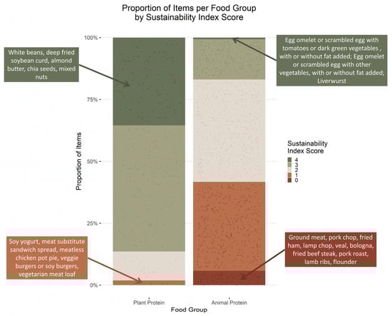 Proportions of items within the Plant Protein and Animal Protein groups that received each Sustainability Index score. Dots represent individual items within each respective portion and food group. Five example items in the highest and lowest scoring groups are presented in colored boxes. There were no items that scored zero points among Plant Proteins.