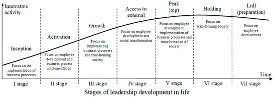 For managing innovation activities, we propose considering the concept of “life development” within a stage-by-stage process, encompassing its unity from the inception of groundbreaking ideas to their eventual absence. Most managers experience cyclical repetition in different phases of managerial activities’ life development, responding to market changes, product obsolescence, modernization, and scientific and technological progress. Despite the diversity in leadership forms, methods, and styles, certain phases in its life development are common and are more influenced by external conditions than the internal traits of the leader [13]. Building upon research sources [14,15], we propose delineating the following stages in the life development of innovation management: initiation, activation, growth, engagement with the external environment, peak performance, maintenance, and a period of calm (preparation) before the start of the next cycle.
