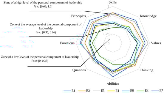 Therefore, based on the assessment results of the personal component in evaluating sustainable leadership of enterprises engaged in circular economy-driven innovative activities, none of the investigated enterprises fell into the low-level zone (). This indicates that all managers are qualified, experienced specialists possessing the necessary set of skills, knowledge, values, thinking abilities, and qualities.