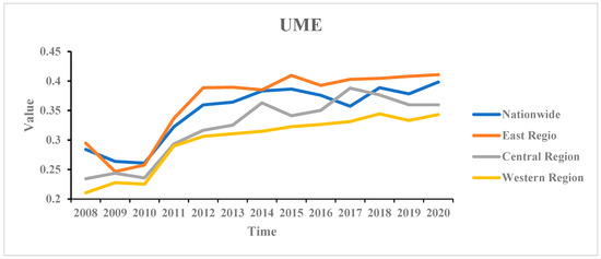 After measuring UME using the SBM model, Figure 2 demonstrates the trend of UME over the study period. Overall, China’s UME shows a dynamic upward trend, which implies that it is meaningful to use China as an effective optimization tool for case-study UME. In terms of sub-region, China’s UME shows a graded differentiation pattern of eastern region > central region > western region, which is similar to China’s economic differentiation pattern and in line with China’s actual situation, indicating that the UME measured in this paper is relatively reasonable.