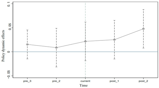 The use of a double differencing model requires that there is no significant difference in UME between the treatment and control groups prior to the implementation of the policy. Therefore, this paper constructs a series of dummy variables for NU. pre_3 and pre_2 denote the dummy variables for the third and second year before the implementation of the NU policy, respectively; current denotes the current period of the implementation of the NU policy; and post_1, post_2, and post_3 denote the dummy variables for the first, second, and third year after the implementation of the NU policy, respectively [105]. To avoid the problem of multicollinearity, this paper uses the year before the policy as the benchmark group. The results in Figure 3 show that none of the coefficients before the implementation of the NU policy is significant, indicating that there is no statistically significant difference between the UME of the treatment group and the control group before the implementation of the NU policy, which satisfies the assumption of the parallelism trend.