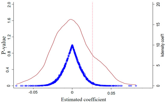 Considering the differences in the timing of policy shocks in the pilot districts in the multi-period DID, in order to avoid non-policy exogenous impacts on the pilots due to the early knowledge of the signal that the policy is going to be implemented, it is necessary to randomize both the pseudo-treatment group dummy and the pseudo-policy shock dummy to conduct a placebo effect test [106]. Therefore, in this paper, we first use Stata17.0 software to construct a pseudo-NU policy to conduct 500 random shocks on 284 samples, each time randomly selecting cities as the experimental group, with the time of the policy randomly given, to obtain 500 sets of dummy variables; subsequently, the 500 dummy variable regression coefficients are used as horizontal coordinates, and the p-value of the regression coefficients and the kernel density distribution are used as vertical coordinates to generate the placebo test results. The results in Figure 4 show that the mean value of the estimated coefficients for the randomly generated treatment group is 0.000103, which is near 0 and far from the baseline regression result of 0.024. This is a further indication that the promotion of UME by NU is relatively robust.
