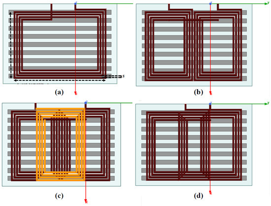 Different coil geometries used in the EV charging IL: (a) Rectangular (D), (b) double-D (DD), (c) double-D quadrature (DDQ), and (d) bipolar coils. Adapted from Ref. [27]. 2021, MDPI.