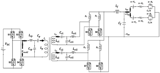 The first step in designing a misalignment tolerant DWC system is to set a benchmark for the maximum allowable lateral misalignment position. This is because correcting for lateral misalignments using compensation network tuning and control loops is only possible as long as there is a partial overlap between the primary and secondary charging pads. This circuit-based correction, however, becomes infeasible as the EV deviates significantly away from the primary coil. In this case, mechanical correction strategies need to be adopted. Nonetheless, this work focuses on improving the power transferred during partial misalignments. Accordingly, the design criteria for the maximum misalignment tolerance of the proposed system is set to of the coil width, w. Furthermore, it is assumed that DWC is utilized by EV drivers when their battery state-of-charge (SoC) is between 20% and 90%, which defines the constant current (CC) charging mode of Li-ion batteries used in EVs [16,66,67]. Hence, the current controller is designed to maintain a constant current supply to the EV battery despite fluctuations in the received AC power. The EV battery is modeled using a first-order Thevenin equivalent circuit, as in [16,68]. The EV battery pack is assumed to consist of two parallel units, each consisting of cells with a nominal voltage of V each. The first-order Thevenin equivalent circuit of this battery pack is presented in Figure 4, where represents the open circuit voltage, models the linear behavior of the battery charging and discharging, and and model the transient behavior of the battery, respectively. An outline of the proposed WPT system is shown in Figure 5 including the EV battery model. The specifications of the remaining system components are detailed in the following subsections.