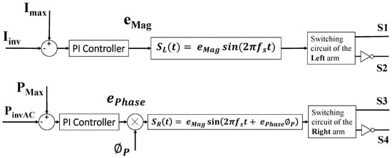 The second PI controller compares the inverter output current, , with the primary side rated current, , to avoid excessive current flow through the coils and protect the semiconductors from current overloading. The comparison between current amplitudes generates an error signal, . denotes the amplitudes of the right and the left switching control signals, and , respectively, at the switching frequency, . is the phase of the signal that generates the required phase shift between the two inverter arms. Then, by comparing the switching signals, and , to a triangular waveform with frequency , the gating signals are provided to the MOSFET devices to achieve the desired power and current control. These primary side control circuits are shown in Figure 6.