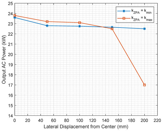 In Figure 9, is the coupling between the primary DD and the secondary DD coils, while is the coupling between the primary DD and the secondary quadrature coils. The plots in Figure 9 together with the DD-DDQ IL coupling performance in Figure 8 reveal that the LCC-LCC circuit with model specifications in Table 2 is able to avoid frequency bifurcation and maintain resonance at the desired operating frequency over the desired range of misalignments, up to 200 mm displacement from the perfect alignment position. The simulated output AC power and the power transfer efficiencies are plotted in Figure 10 and Figure 11, respectively, for the two tuning conditions: and .