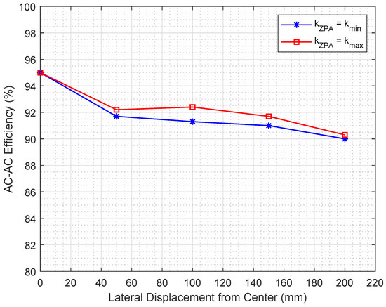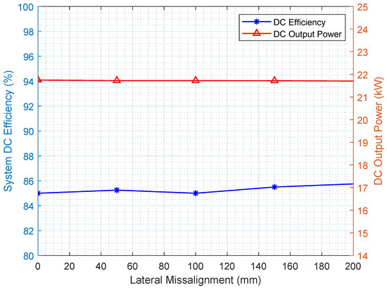 The AC-AC power transfer efficiencies reported in Figure 11 demonstrate a similar behavior for both tuning conditions. The DC results are also plotted in Figure 12, showing a lower charging power with a lower efficiency compared to the AC case. This can be resorted to the losses in the semiconductors of the two rectification circuits connected to the secondary-side coils. The maximum DC output power is kW at perfect alignment and kW at mm lateral misalignments. The DC-DC power transfer efficiency levels fluctuate within 85–, which is a relatively stable performance. The superiority of the proposed design is further confirmed by comparing the simulation results of the proposed system to those reported in the literature for other wireless charging system. This comparison is summarized in Table 3.