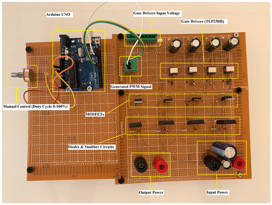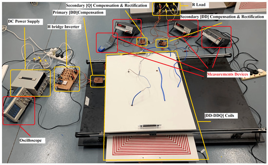 In order to verify the performance of the proposed system, an experimental prototype was constructed with a DD-DDQ IL and the proposed compensation, rectification and control topologies explained earlier, as shown in Figure 13. This prototype aimed to verify the advantages of using a multi-coil secondary structure to mitigate the lost power at high misalignments by maintaining reasonable coupling values at mm displacement from the perfect alignment position while eliminating the power null point as long as there was an overlap between the transmitter and receiver pads. In addition, the prototype demonstrated how the primary side controller was essential to increasing the efficiency of the system by controlling the duty cycle of the inverter arms. The IL was constructed following the specifications in Table 1, as shown in Figure 14. The air gap distance was set to 150 mm to allow sufficient coupling between the primary and the secondary coils. Due to experimental limitations and the need to operate within safe power levels, the proposed system was downscaled to operate at W at the 85 kHz resonance frequency. The primary side consisted of a pulse generator used to generate a square wave signal at an 85 kHz frequency. An Arduino Uno was used for this purpose to generate two inverted signals with a specific dead time between them to ensure safe conduction of the MOSFETs. A high-frequency DC/AC inverter was then connected in the form of an H-bridge inverter consisting of 4 IRF N-Channel type MOSFETs. The MOSFET ratings were selected to allow the downscaled system to operate as desired. Free-wheeling diodes were also connected to each MOSFET device to enable high-frequency operation, together with other resistors, capacitors and diodes. A Toshiba TLP250H gate driver was connected to each MOSFET gate to overcome the high-side MOSFET operation issue. The circuit construction of the H-bridge inverter is shown in Figure 15 and complete details of the hardware specifications are presented in [19].