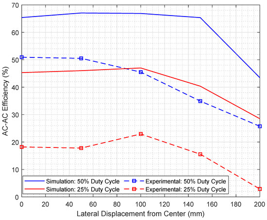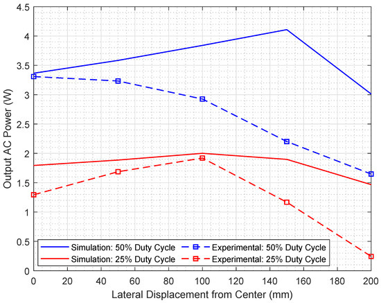 The experimental output power and the simulation results of the corresponding model are reported in Figure 17, while the corresponding AC-AC power transfer efficiencies are reported in Figure 18, at both and duty cycles. A close agreement is observed between the output power results at duty cycle, particularly at 100 mm displacement from the center. A discrepancy is observed, however, between the output power results at duty cycle. A difference of about 15–25% is observed between the simulation and experimental efficiencies is observed in Figure 18, although the overall pattern is maintained. In order to further investigate these differences between the simulation and experimental outcomes of the 6 W system, the simulation and experimental results of the secondary-side-induced voltages at perfect alignment, i.e., 0 displacement, and at 100 mm and 200 mm lateral displacements, are explicitly reported for different inverter duty cycles in Table 5, Table 6 and Table 7, respectively.