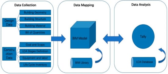 26]. This framework, which creates a seamless integration of an embodied carbon assessment within BIM, informs the identification of the primary life cycle stage and material contributors to the embodied carbon and other life cycle environmental impacts. The proposed framework consists of three fundamental steps: data collection, data mapping, and data analysis (
