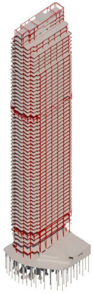 The case study assessed in this work is an actual 60-story high-rise office building with a core outrigger-reinforced concrete and steel composite structure located in Chicago, USA. The building stands at a height of 835 feet (255 m) with a total gross area of 1,475,500 square feet (137,078 square meters). Completed in 2023, the building contains three subterranean levels, fifty-eight above-ground stories, a mechanical penthouse level, and a roof level (i.e., resulting in sixty above-ground stories). It is important to note that the authors of this article do not deserve any credit for, and did not participate in, any design (architectural, structural, etc.), consultancy, and construction activities in the case study project.