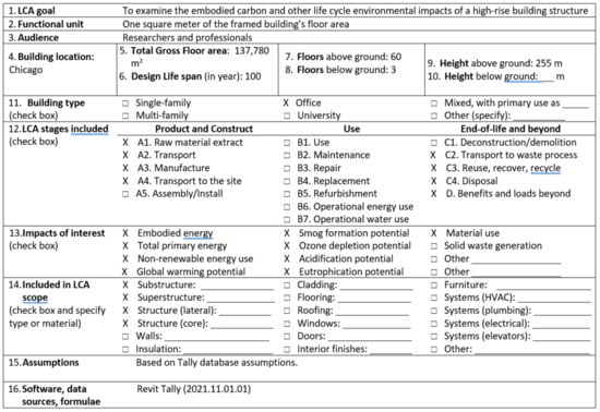The embodied carbon and environmental impacts of an actual high-rise building case study is assessed, with a focus on the building structure, for the entire building life span including the product stage (A1–3), construction stage (A3–5), end-of-life stage (C), and beyond-life stage (D). The use stage is not relevant to the scope of this research, because the building structure, which is the focus of this research, does not require repair, replacement, and maintenance during the building’s normal life span. The assessment is conducted through a detailed construction material specification in Tally, with a Bill of Material produced by Revit, which leads to detailed and comprehensive environmental impact results generated by Tally based on the GaBi Database life cycle inventory (LCI). Autodesk Revit is a building information modeling tool used by architects and engineers to develop digital models of buildings and specify construction materials. Revit works with a range of plugins to simulate the environmental performance of buildings. Tally is the plugin used by Revit for LCA assessment. Tally is consistent with LCA standards ISO 14040–14044 [