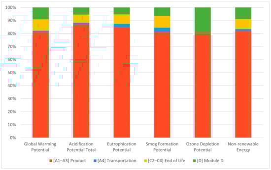 Figure 5 shows the varying percentages of the contribution to environmental impacts that occur across the product, transportation-to-site, end-of-life, and module D stages. In line with the literature, the product stage (A1–3) is the dominant contributor to the building’s embodied carbon (i.e., construction-related global warming potential) and other life cycle environmental impacts, with a contribution that ranges from 81% (e.g., of embodied carbon) to about 87% (of acidification potential). The contributions of the end-of-life (C) stage to the environmental impacts varies depending on the impact category, ranging from about 6% (in case of the acidification potential) to 9% (in case of the embodied carbon or smog formation potential). A similar pattern is observed in the contribution of module D. For example, module D contributes 9% to embodied carbon (