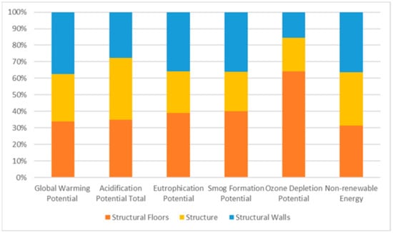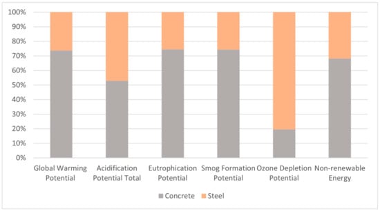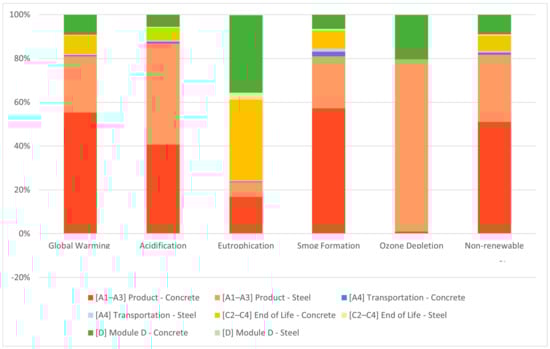 Figure 7). Also, in the product stage (A1–3), concrete contributes 61% to the eutrophication potential, 57% to the smog formation potential, and 51% to the non-renewable energy usage, while the steel contributes 24% to the eutrophication potential, 24% to the smog formation potential, and 31% to the non-renewable energy usage.