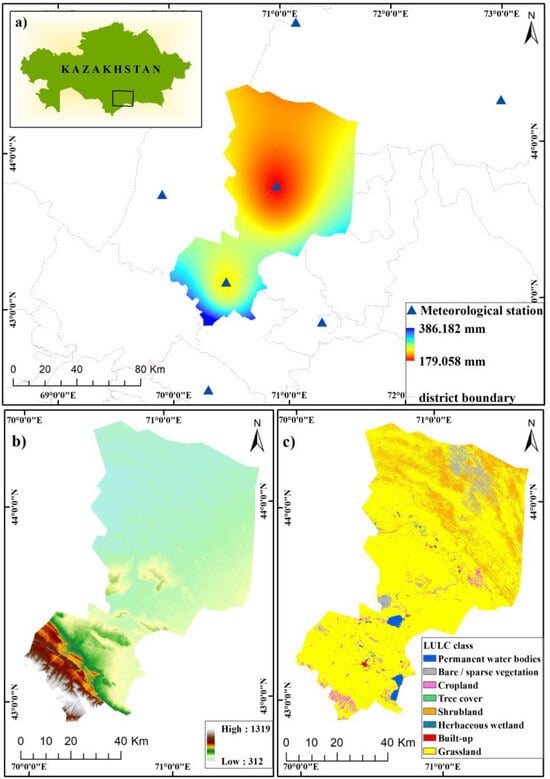 Description of the study domain: (a) Kazhydromet spatial distribution of annual average precipitation from 1980 to 2014 and district boundary; (b) digital elevation model (DEM); (c) Land cover and land use.