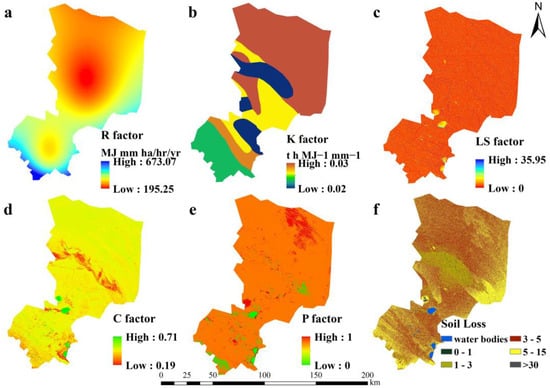 The RUSLE factors as follows: (a) rainfall erosivity map, (b) soil erodibility map, (c) slope length and slope steepness map, (d) cover management map, (e) conservation practice map, and (f) annual average soil erosion map of the Talas district.