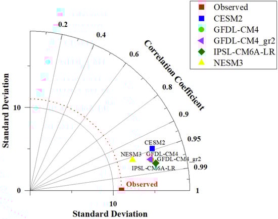 Taylor diagram. The precise reduction in precipitation in relation to the observed data over the historical period (1980–2014).