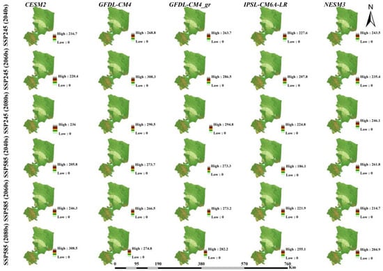 The top five models, namely, CESM2, GFDLCM4, GFDLCM4gr, IPSL CMA6LR, and NESM3, were selected and are highlighted in bold in Table 6 and presented in Figure 3. The selected set of GCMs (emission scenarios SSP245 and SSP585) were then used to create three time domains to predict climate variables in the Talas region. The estimation of potential climatic changes for three distinct time intervals, namely 2040 (2026–2050), 2060 (2051–2075), and 2100 (2076–2100), can be assessed based on the baseline period of 1980–2014.