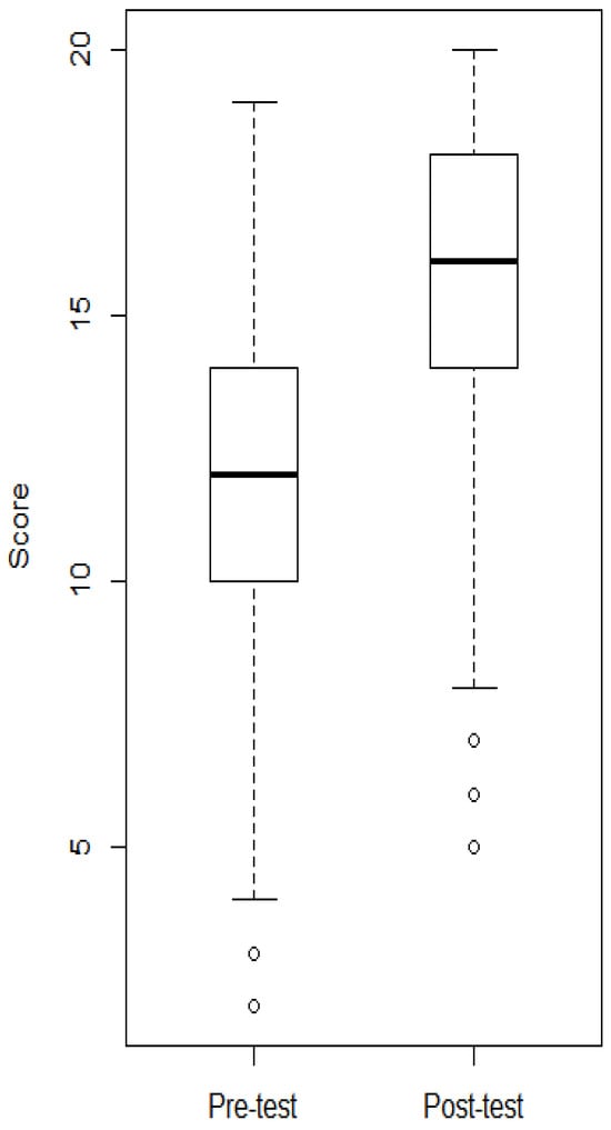 Pre- and post-test scores considering all the participant students. [Middle line—median; box lower and upper limits—1st and 3rd quantiles; whisker values—1.5 times the interquartile range from the top (or bottom) of the box to the furthest datum; points—outliers].