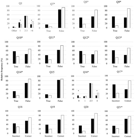 Regarding the questions of “knowledge” and “consumption habits” significant statistical differences between most of them were obtained, namely Q7 to Q14, Q17, and Q21, where the number of wrong answers decreased in the post-test. In questions Q1 and Q16, significant statistical differences were observed only for the percentage of students that chose options (b) and (d), and (a) and (d), respectively (t < 1.98; Figure 3). Q15 was the only question where no differences were observed.