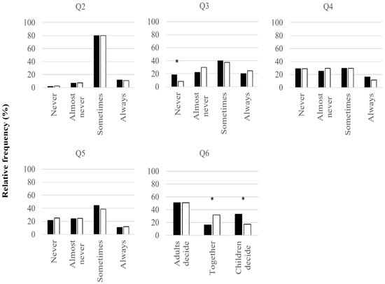 In general, no statistically significant differences between pre-and post-test questions regarding the “consumption habits” category were observed, except for (1) the percentage of students who answered, “Never bought fish” (Q3) that decreased significantly in the post-test; (2) in Q6, the percentage of students who answered “We decide together” and “I decide what to eat”, that significantly increased and decreased, respectively, in the post-test (t < 1.98; Figure 4).