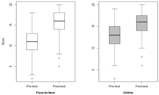 Face-to-face and online scores obtained in pre- and post-tests (white, Pre-test; grey, Post-test). [Middle line—median; box lower and upper limits—1st and 3rd quantiles; whisker values—1.5 times the interquartile range from the top (or bottom) of the box to the furthest datum; points—outliers].